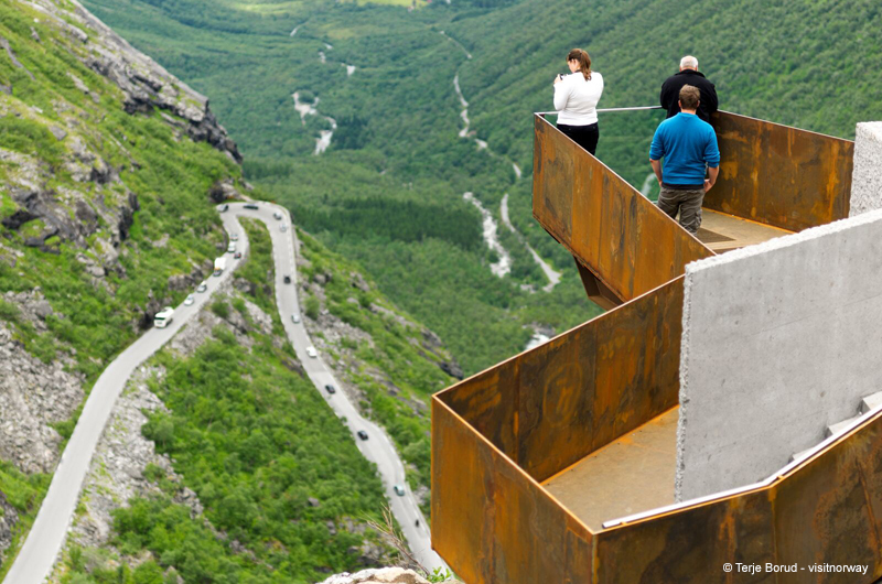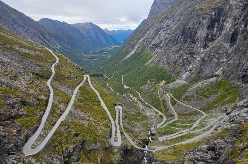 Je nach Ankunftszeit lohnt sich die Fahrt über Åndalsnes und den Trollstigen – eine der spektakulärsten Panoramastraßen Norwegens (in der Regel von Mitte Juni bis Ende September geöffnet).