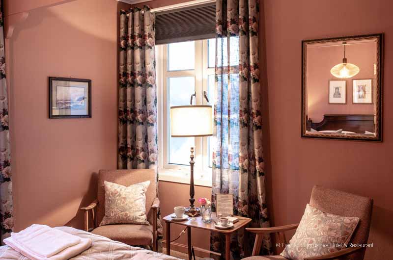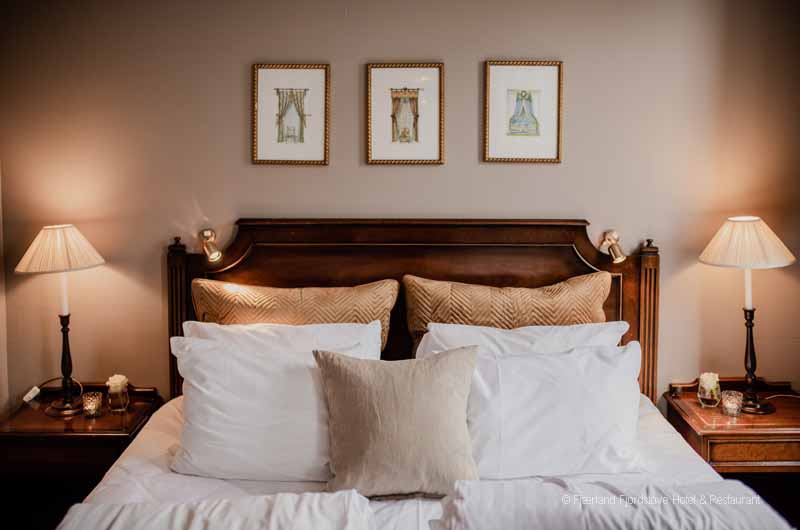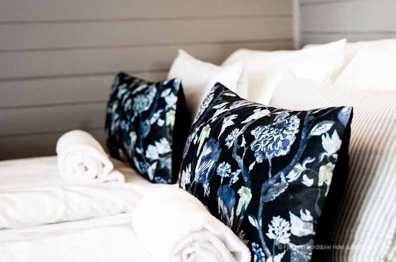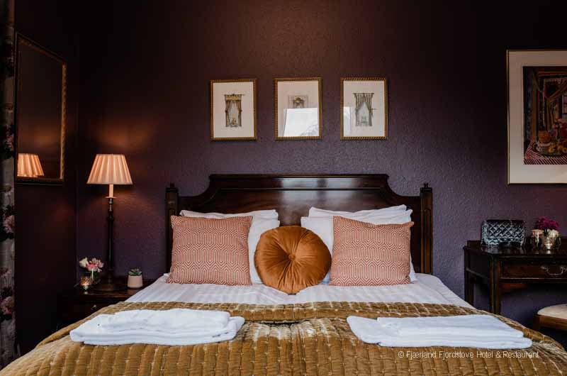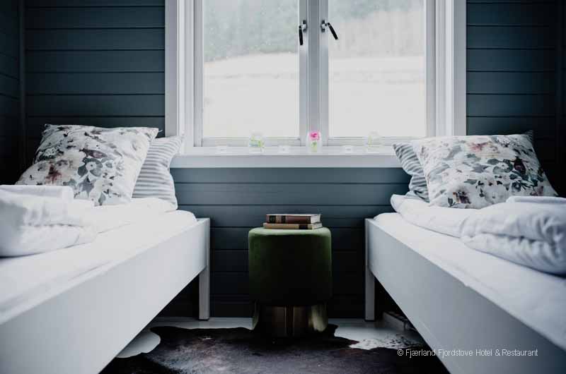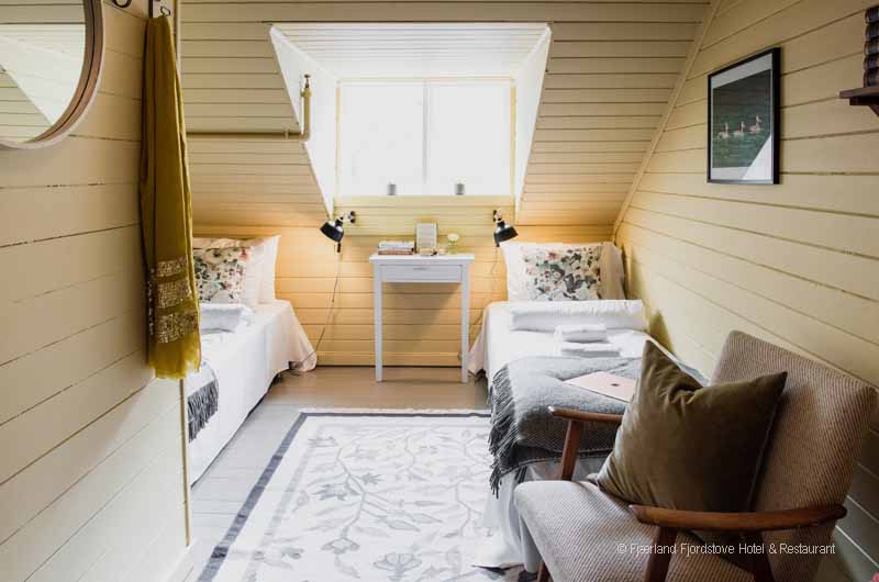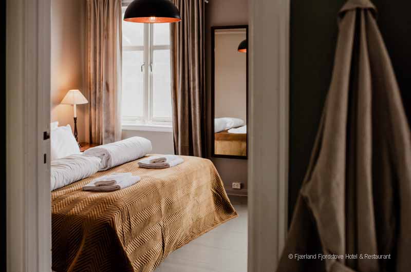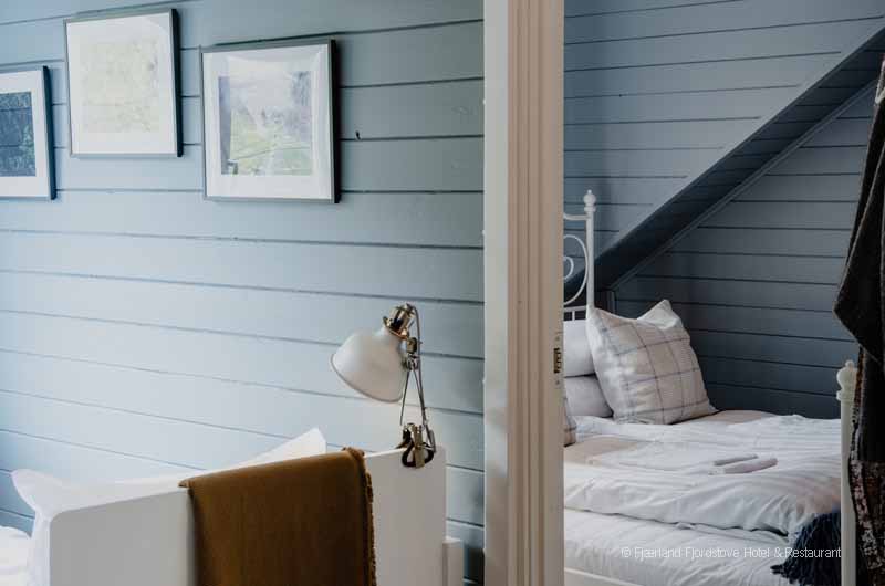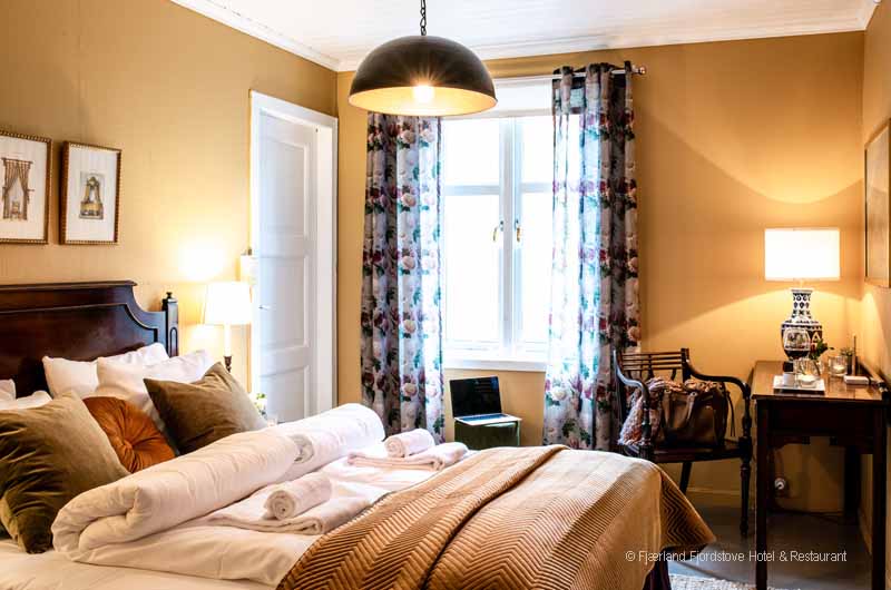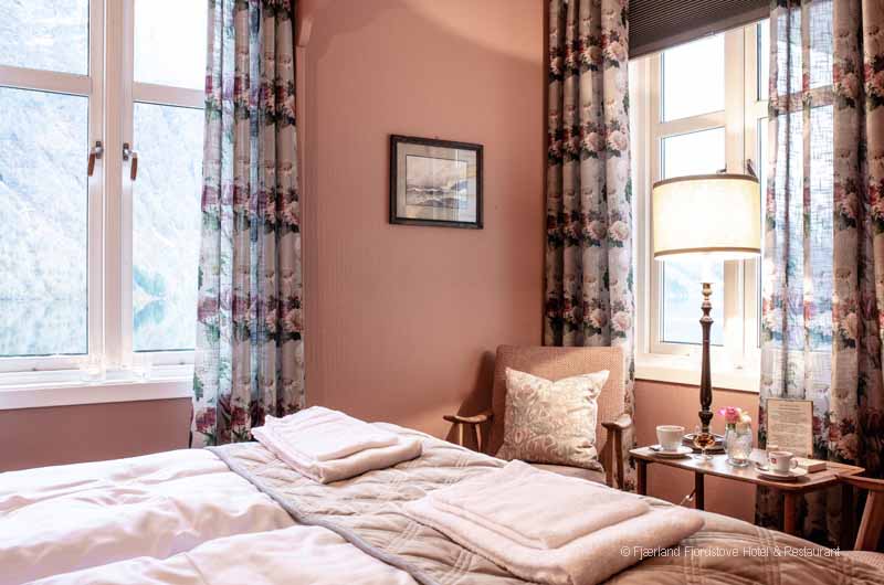 Jedes der Zimmer ist individuell im historischen Norwegenstil eingerichtet. Das Platzangebot in den Zimmern ist durch die alte Bauweise des Gebäudes limitiert. Gäste, die große Hotelsuiten suchen sind im Fjordhotel Fjärland am falschen Platz. Dafür finden Sie im gemeinsamen Aufenthaltsbereich viele gemütliche Ecken zum Schmökern, unterhalten oder einfach nur zum stillen Genießen des herrlichen Ausblickes.