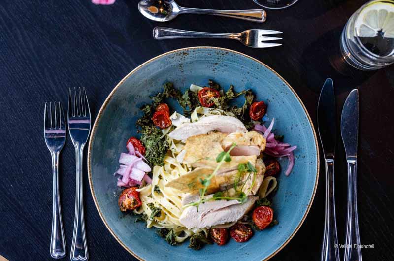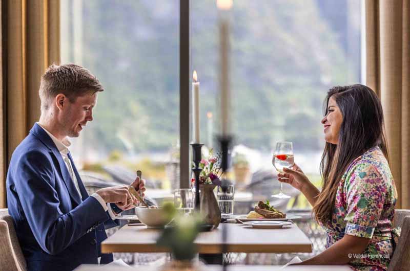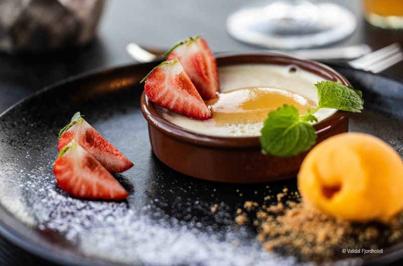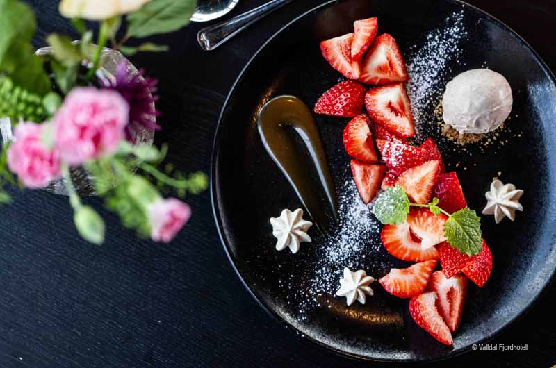Am Abend lockte das Restaurant – und was für eines! Der Küchenchef legt großen Wert auf regionale Zutaten: fangfrischer Lachs, Beeren aus dem Valldal-Tal (übrigens berühmt für seine süßen Erdbeeren!), hausgemachtes Brot und Kräuter aus dem eigenen Garten. Durch die großen Panoramafenster sah ich, wie die Sonne langsam verschwand, während das Wasser in Goldtönen glitzerte.