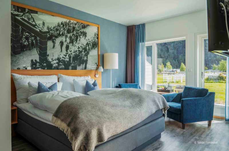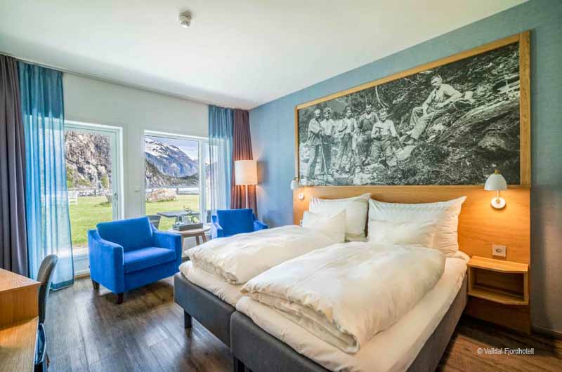 Schnelles WLAN, ein bequemes Doppelbett, ein modernes Bad und – der Star des Zimmers – der Fjordblick, der jeden Bildschirm ersetzt.
