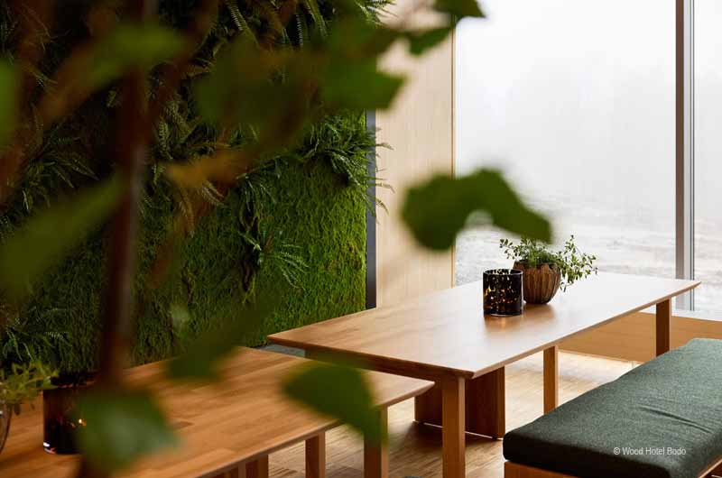 Mit über 150 Zimmern verbindet das Wood Hotel die Größe eines Stadthotels mit der Atmosphäre eines Boutique-Hotels. Das moderne, nachhaltig gebaute Designhotel aus Holz vermittelt sofort Wärme und Behaglichkeit. Bodentiefe Fenster und lichtdurchflutete Räume schaffen eine besondere Verbindung zwischen Innenraum und Natur.