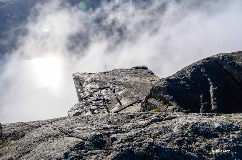 - Kjerag: Am Südufer erwartet Sie ein gewaltiges Hochplateau, in dessen Felsspalte der berühmte Kjeragbolten – ein fünf Kubikmeter großer Felsbrocken – in 1.000 Metern Höhe über dem Fjord eingeklemmt liegt.