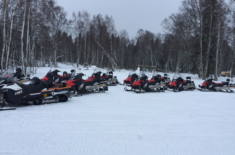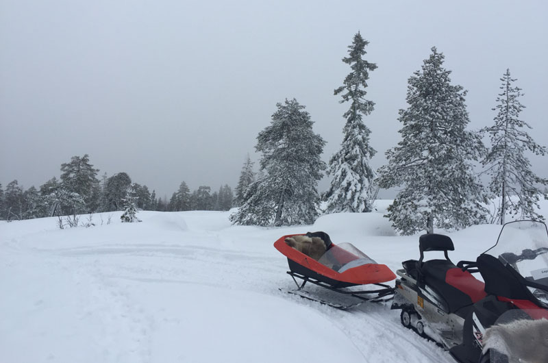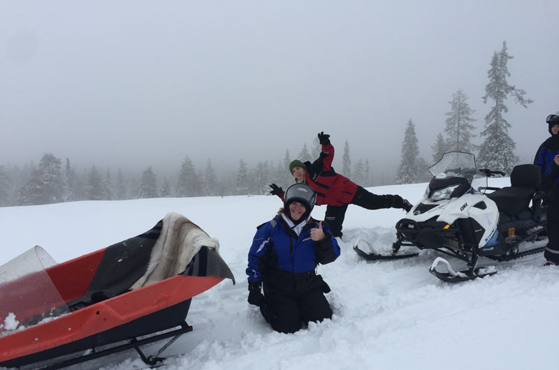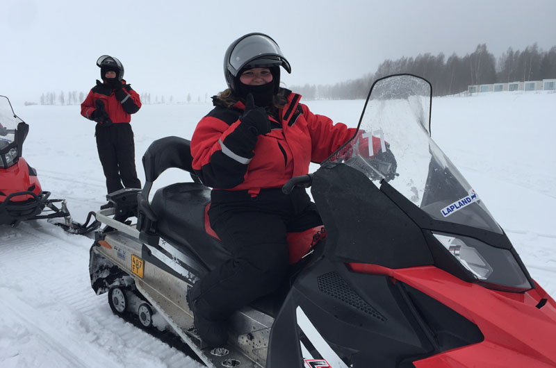 Am nächsten Tag wurden wir nach dem Frühstück mit Overalls eingekleidet. Mit dem Schneemobil ging es über zugefrorene Seen und durch verschneite Wälder. Alle Schneemobiltouren finden auf speziell präparierten Wegen für die Motorschlitten statt. Danach ging es weiter nach Haparanda in Schweden. Nach einer weniger erfolgreichen Runde Eisangeln auf dem Tornionjoki ging es dann mit dem Skidoo zurück zum Hotel. Mit einer privaten Sauna und einem Jacuzzi konnten wir den Abend ganz entspannt ausklingen lassen.