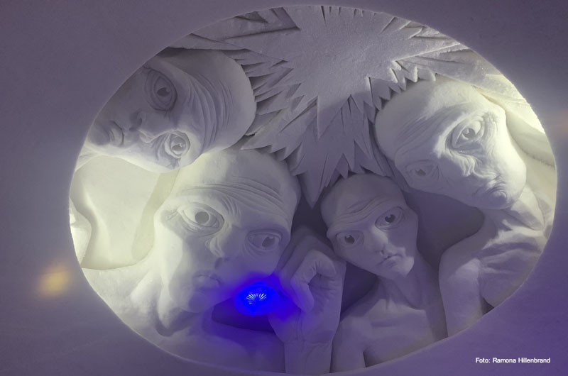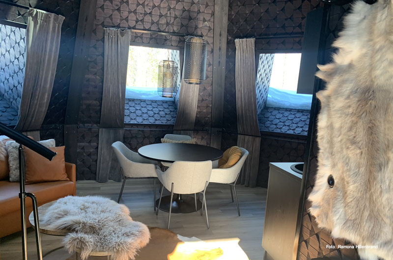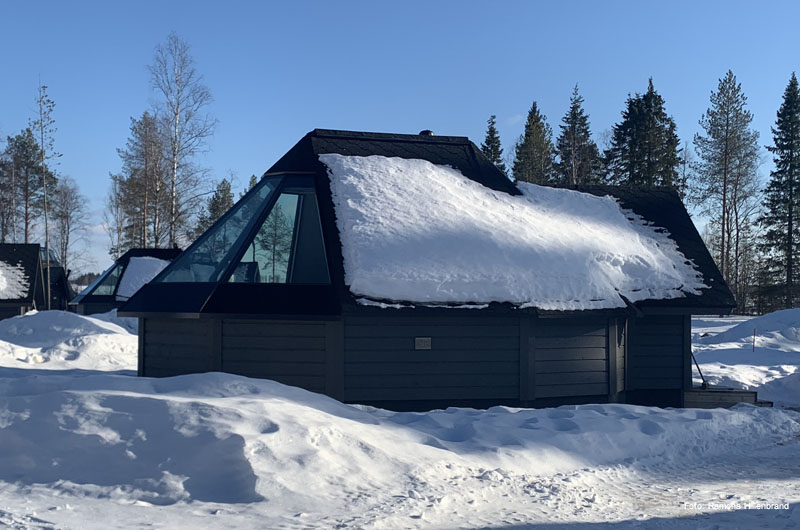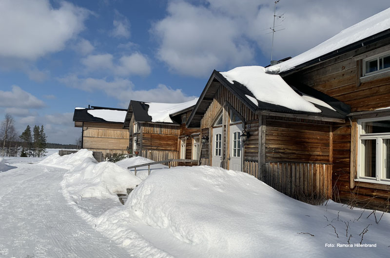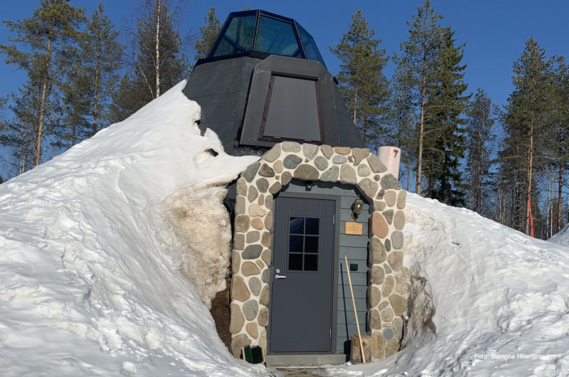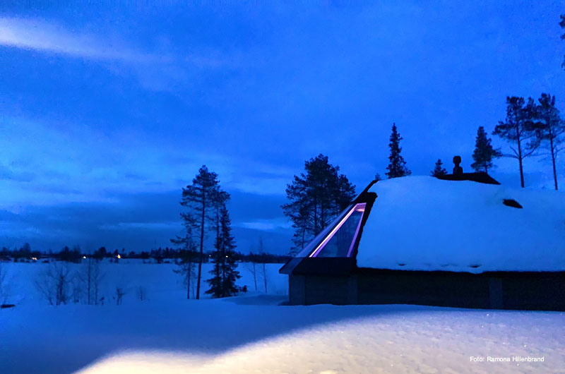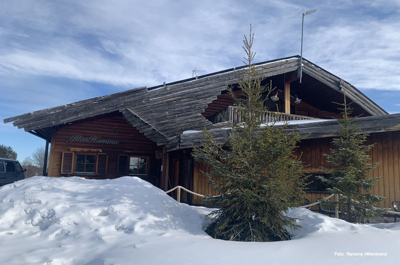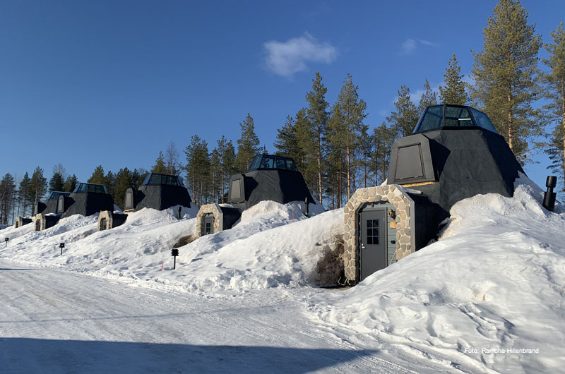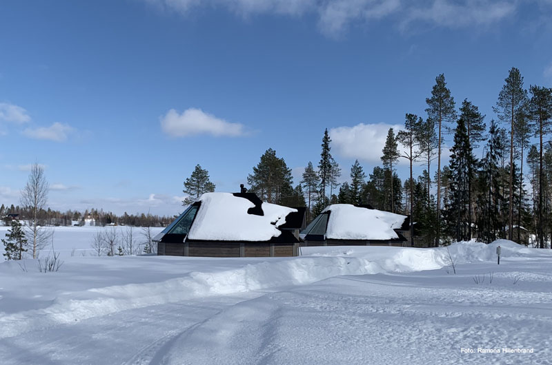 Am nächsten Tag ging es nach dem Frühstück direkt weiter Richtung Ylläs. Übernachtet haben wir in einer der beliebten Blockhäuser-Doppelhaushälften beim Lappland Hotel Akäshotelli. Die Hütten mit Sauna und Kamin sind gemütlich und bieten Ruhe und Stille nach einem anstrengenden Tag auf den zahlreichen Loipen und Pisten. Am nächsten Morgen fuhren wir direkt nach dem Frühstück weiter zu unserem allseits beliebten Lapplandhotel Humina, welches nur 3,5 km vom Lapplandhotel entfernt liegt. Schon seit Jahren fühlen sich unsere Gäste dort wie Zuhause. Endlich hatte auch ich die Möglichkeit die Unterkunft persönlich kennen zu lernen. Ein tolles Hotel, welches im samischen Stil erbaut wurde. Eine wunderschöne winterliche Oase am Fuße des Ylläsberges! Herzlichen Dank für den Rundgang Toivo! Auf dem Weg weiter Richtung Süden haben wir noch einen kurzen Zwischenstopp im Schneehotel Lainio eingebaut. Es ist immer wieder erstaunlich, welche Kunstwerke mit Eis und Schnee geschaffen werden können.