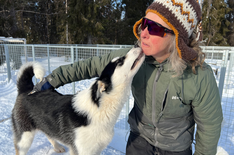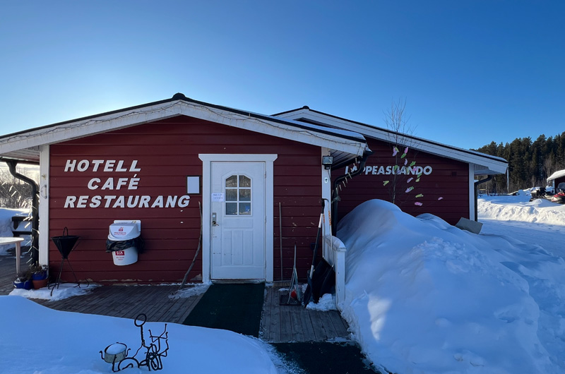 Nach dem Rundgang durch das Dorf habe ich mich auch wieder mit dem Auto Richtung Schweden aufgemacht – mein nächstes Ziel: unsere Lapplandlodge Suando. Kaum über die schwedische Grenze gefahren, konnte ich einige freilebende Rentiere bestaunen. Fun fact am Rande: Die Rentiere haben in Skandinavien immer Vorfahrt! Nicht anhupen oder überholen! Das kann teuer werden. Am frühen Abend bin ich in der Lodge angekommen – nach all den Jahren habe ich mich sehr darauf gefreut, diese Unterkunft endlich persönlich kennen zu lernen. Das Hotel verfügt über 9 gemütliche Zimmer, ein Restaurant, ein Saunahaus und eine eigene, kleine Huskyfarm. Vor einiger Zeit hat hier ein Besitzerwechsel stattgefunden und ich war sehr gespannt darauf, die neuen Besitzer, Natalie und Eric persönlich kennen zu lernen. Ich wurde von Natalie auch schon empfangen. Nach einem leckeren Abendessen und einer Führung über das Gelände ging es für mich auch schon ins Bett. Am nächsten Morgen haben mir Natalie und Eric noch die Huskyfarm gezeigt und sind mit mir in das Wildniscamp gefahren. Mit dem Schneemobil ging es über den verschneiten Kalix See Richtung Wildniscamp. Danke, Natalie und Eric – ich komme wieder!