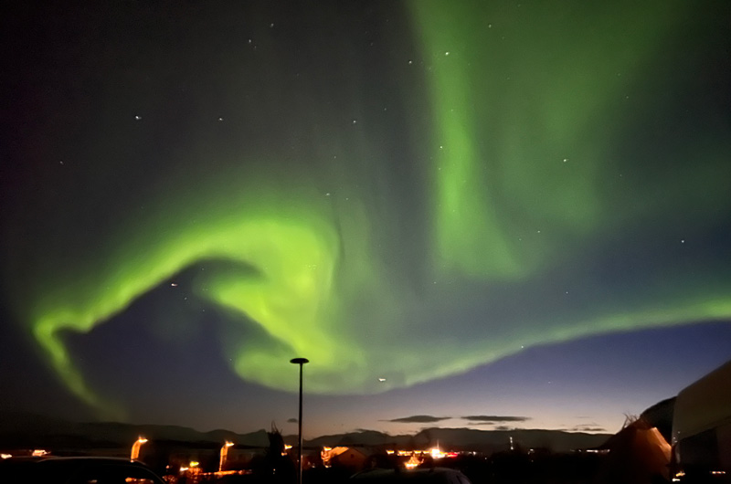 Mit dem Mietwagen ging es dann von Inari den ganzen Weg nach Kilpisjärvi – dank eines kleinen Schneesturms musste ich sogar einen Umweg über Sodankylä fahren! Nach einer knapp 7 stündigen Autofahrt durch die verschneite Landschaft bin ich in unserer Cahkal Lodge angekommen. Im äußersten Nordwesten Finnlands ist das Hotel eingerahmt von purer arktischer Bergwildnis. Eine perfekte Wohlfühlbasis um die fantastische Weite der Natur im Grenzgebiet von Finnland, Norwegen & Schweden zu genießen. Eine der Hotelinhaber, Margit, hat mich schon freudig begrüßt. Mit netten Gesprächen & gutem Essen und einem Rundgang durch das schöne Hotel haben wir den Abend ausklingen lassen. Gerade im Bett meldete sich meine Aurora Alarm-App auf dem Handy – also wieder rein in die dicken Winterklamotten und raus auf den Parkplatz und voila – die Nordlichter tanzten munter durch die Nacht. Trotz vieler Reisen in der Vergangenheit in den Norden hatte ich an diesem Abend die stärksten Nordlichter, die ich bisher bestaunen durfte. Ein absolut magisches Erlebnis! Nach einer kurzen Nacht hat mir Margit noch das Dorf Kilpisjärvi am Berg Sanna gezeigt. Herzlichen Dank für eure Gastfreundschaft, Cahkal Lodge!