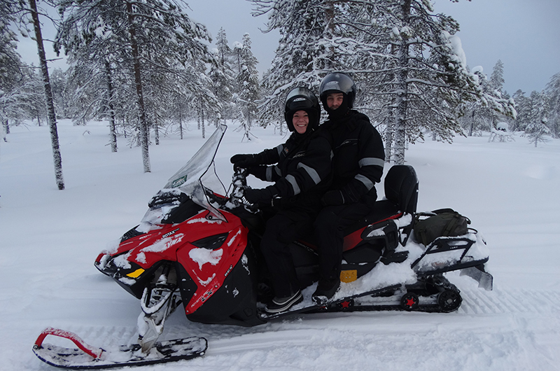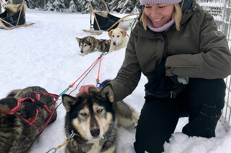 Unser gemütliches Holzhaus mit offener Feuerstelle und eigener Sauna lässt uns direkt wohlfühlen. Hier entspannen wir nach all unseren Aktivitäten. Zuerst geht es Schneeschuhwandern im Oulanka Nationalpark. Die unmittelbare Gegend erkunden wir bei einer Schneemobiltour oder auf den Langlaufski. Mein absolutes Highlight ist aber die Schlittenhundesafari bei Erä Susi. Auf der Huskyfarm war ich 2015 als freiwillige Helferin. Ich bin überglücklich, als ich einige der Hunde wiedererkenne. Die blauäugige Rita und der gelassene Asterix sind zwei der sechs Hunde unseres Teams. Sie ziehen uns durch die glitzernde Landschaft.