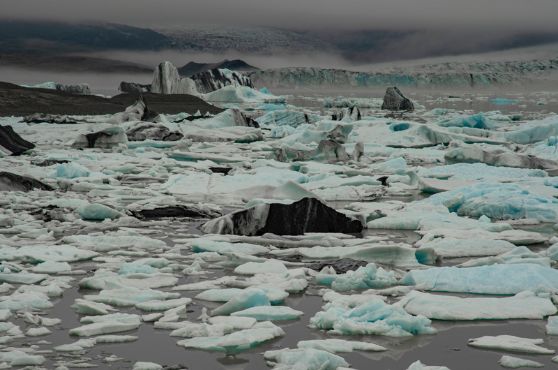 In der Nachbarschaft zum Gletschersee Jökulsárlón lohnt auch der kleinere Fjallsárlón einen Abstecher. Mit dem Schlauchboot kommt man hier den Eisbergen besonders nahe. Hier erlebe ich den besonderen Reiz des sich schnell ändernden Islandwetter. Es hatte inzwischen zugezogen. Das letzte Schlauchboot war auf dem Weg zum Anleger. Über dem Gletscher lag Nebel, dazwischen gab es einen nebelfreien Streifen, darunter erneut Nebel. Etwas Mystisches ging in diesem Moment von dieser Landschaft aus. Es war kein langes Schauspiel, aber diese Viertelstunde war richtig klasse.