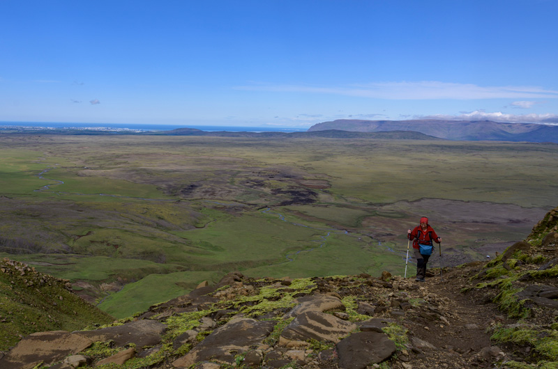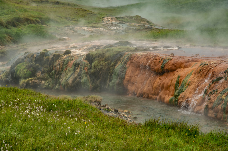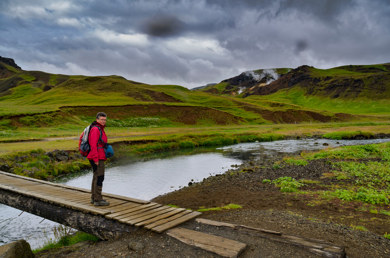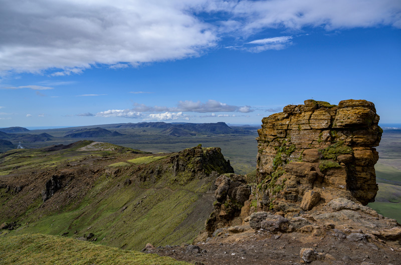 Bevor ich mich auf den Weg zu den Highlights entlang der Südküste machte, durfte auch Hveragerði nicht fehlen. Der Ort ist die Quelle einer besonderen Spezialität: Hverabrauð, ein in heißer Vulkanasche gebackenes malzig-süßes Brot. Es wird mit Butter angeboten. Schmeckt prima. Auf meinem Plan steht der „Klassiker“ Reykjadalur, eine faszinierende Wandertour zu heißen Badequellen im Gebirge. Pferdefreunde unternehmen diese Tour als „Kombi“ und reiten mit Islandpferden hinauf. Das letzte Stück wird dann auf Schusters Rappen zurückgelegt. Während die Reiter in der heißen Quelle entspannen, verschnaufen die Pferde. Auf jeden Fall Badesachen mitnehmen. Das Wetter war auch am Folgetag gut. Ideal für meine längere, anspruchsvollere und einsame Wanderung mit imposanten Ausblicken. Die Tour startet am Kraftwerk Hellisheidi. Das liegt zwischen Reykjavik und Hveragerði. Steil bergan zeigt der Streckenabschnitt zunächst seinen vulkanischen Charakter mit seinem bunten Gestein und den Dampfsäulen des Kraftwerkes. Später führt er über ein flaches Hochland mit einem sprudelnden Bach mit leuchtend grünem Moos, um dann hoch an Felsentürmen vorbei zum Aussichtspunkt mit 360° Panoramablick zu enden. Gerade einmal drei Autos parkten am Ausgangspunkt. Natur und Ruhe pur.