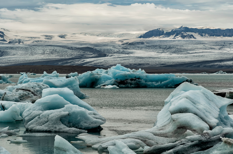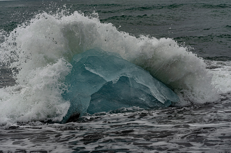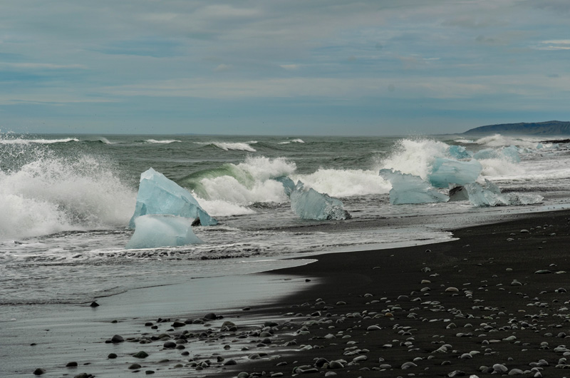 Ich nähere mich gemütlich dem nächsten Superlativ – Jökulsárlón. Wohl dem, der Zeit hat und sich sein eigenes Zeitfenster wählen kann. Früh am Morgen ist es noch still. Es ist absehbar, dass die Sonne heute wenig spektakulär über dem Meer aufgeht. Daher lasse ich den Strand „links liegen“ und spaziere Richtung Gletschersee. Ich liege richtig und freue mich über mein Fotomotiv: Das schwache Sonnenlicht taucht den Gletscher, seine Eisberge und die Lagune in ein sanftes Rosa. Es umgibt mich eine angenehme Ruhe und Stille, bis das erste Amphibienfahrzeug später zum Ausflug auf den Gletschersee startet. Jetzt beobachte ich das Wechselspiel von Ebbe und Flut. Durch die Gezeiten treiben die riesigen Eisberge über einen kurzen Fluss hinaus auf das offene Meer. Zeit für einen Wechsel zurück auf die Strandseite. Ich bin fasziniert von den weiß-blau schimmernden Eisblöcken, die im Lava-Sand stranden oder im Meer schaukeln, bis sie das Salzwasser schmilzt.