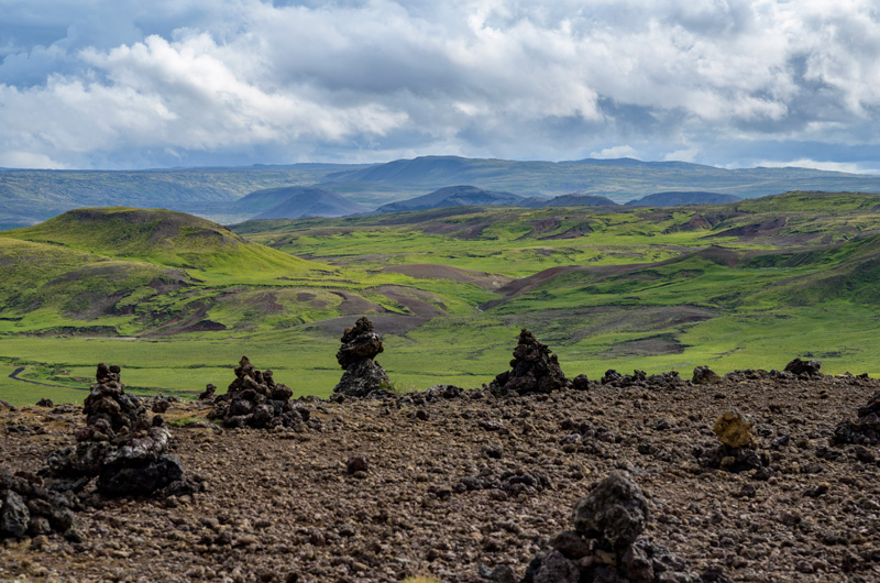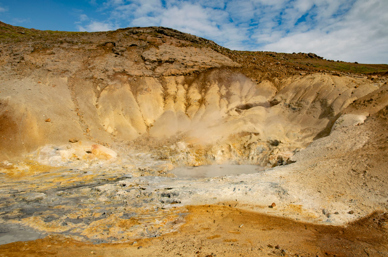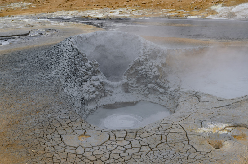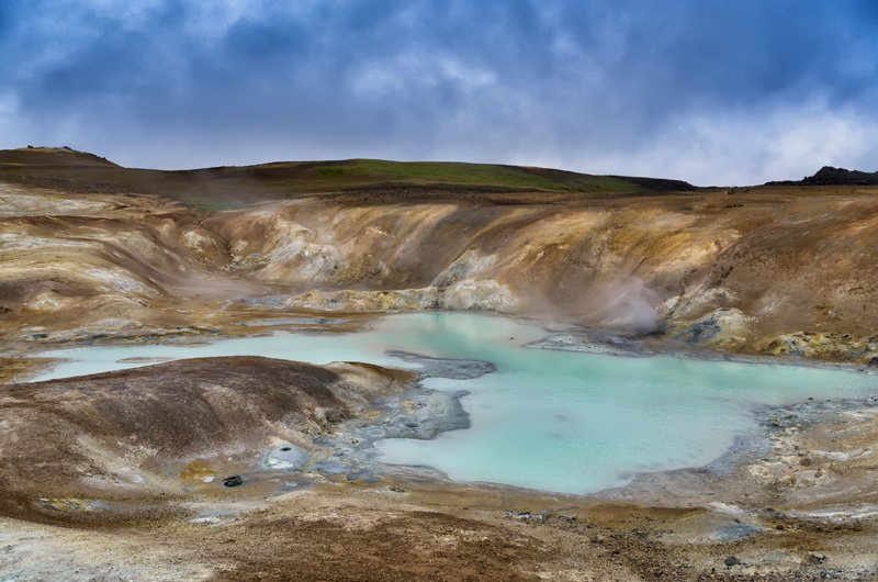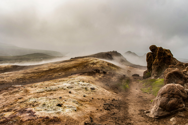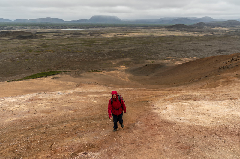 Begeistert trete ich die Rückfahrt zum Mývatn an. In meinen Reiseführern habe ich schon viel gelesen und meine Erwartungen werden nicht enttäuscht. Nicht nur, weil hier mit dem Naturbad Jarðböðin eine „Blaue Lagune“ zur Entspannung entstand. Auch das nahegelegene und leicht zu erreichende Hverir liegt direkt an der Ringstraße. Überall steigen Rauchwolken in den Himmel und es brodelt und zischt. Durch die schnelle Erreichbarkeit sind auch hier Busse unterwegs und man ist nicht allein. Mein Vorteil ist meine Flexibilität. Ich nehme mir die Zeit und wähle die kleine, ca. 1-stündige Wandertour, die steil hinauf über den Gipfel Námafjall führt und mir gigantische Ausblicke auf das gesamte Mýatngebiet gewährt. Selbst hier oben raucht es aus Ritzen und Spalten – und es sind nur wenige Mitstreiter unterwegs.
