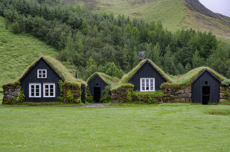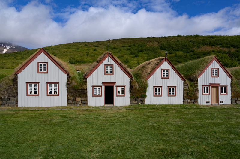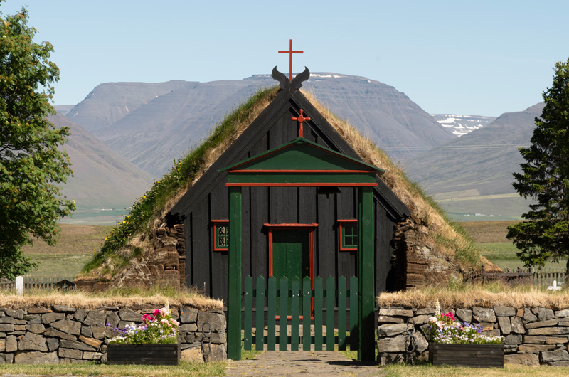 Auf dem Weg nach Akureyri liegt der Goðafoss direkt an der Ringstraße. Geduld ist heute angesagt, denn es herrscht typisches Islandwetter – wolkenverhangener Himmel und gerade mal 7°C Außentemperatur. Passionierte Fotografen schreckt es nicht. Und es lohnt sich warm eingepackt auszuharren. Gerade ein paar wenige Minuten und die Sonne blinzelt durch die Wolken und wirft ihr Licht auf die Wassermassen, die hier 10m tief fallen. Ein tolles Naturspektakel. Man kann sowohl unten als auch oben am Wasserfall stehen und schauen. Im Idealfall ist man früh vor Ort, wenn noch keine Busse unterwegs sind. Kurz vor Akureyri hat man die Wahl – die Mautstraße oder aber über die 84 (die alte Ringstraße) über das Gebirge hinunter nach Eyjafjörður. Ich entscheide mich für die 84. Unten am Fjord Eyjafjörður angekommen biege ich aber erst einmal rechts nach Laufás. Eines der angeblich schönsten Museumshöfe Islands steht auf meinem Plan. Begrüßt werde ich von zwei sympathischen in Tracht gekleideten Damen, die neben dem Souvenirshop auch das Café betreiben. Für ein Stück Kuchen ist es bei mir schon zu spät, denn ich möchte mir noch die fünf Häuschen des Gehöfts mit den aus grasbewachsenen Torfsoden und die aus dem Jahr 1865 Jahr stammende Holzkirche anschauen.