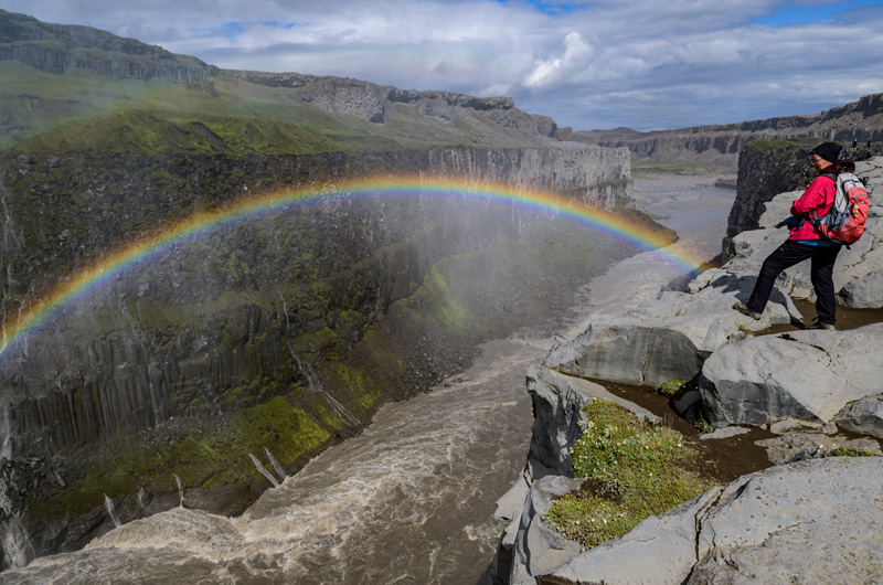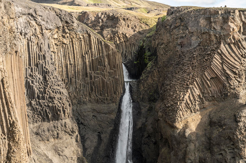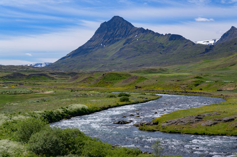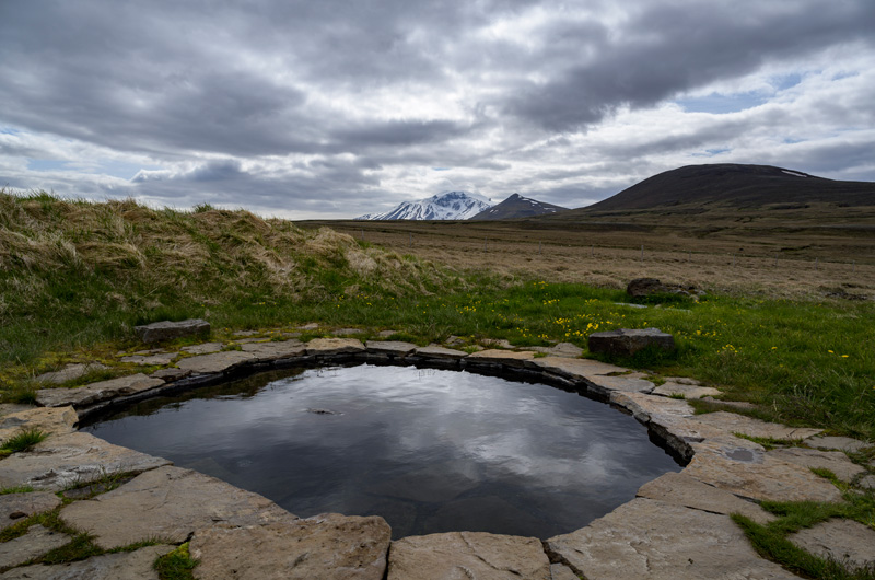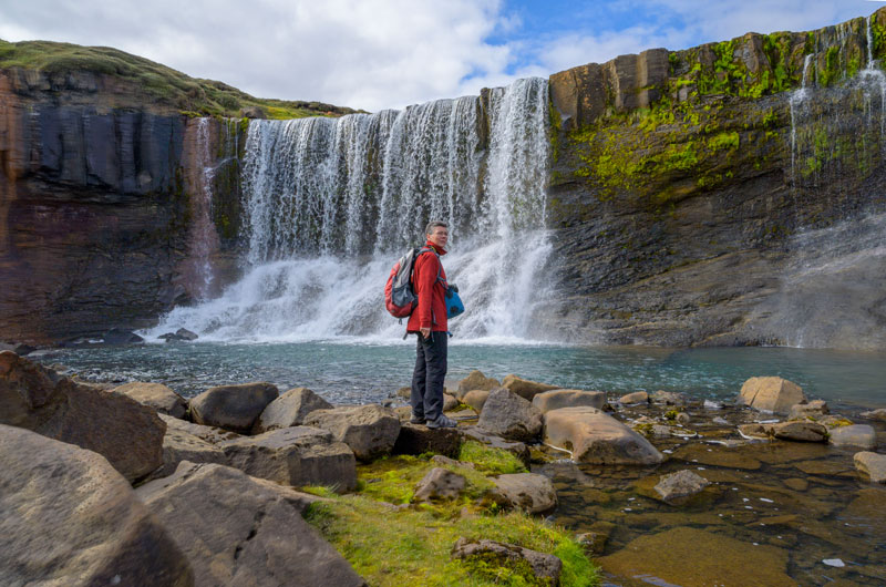 „Hochland für Anfänger“ steht auf meinem Programm. Die Fahrt führt von Egilsstaðir erst einmal am Lagarflót entlang zum Hegnifoss. Ein schön angelegter Weg führt vom Parkplatz hoch zum Wasserfall. Vom Hegnifoss fahre ich weiter Richtung Snæfell. Die Straße ist dank des dort errichteten Staudamms asphaltiert und auch für normale Pkw befahrbar. Auch wenn ich mangels Allrad nicht die abzweigenden Straßen der Allradpisten befahren kann gibt es mir doch ein gewisses Hochlandgefühl. Auf der Strecke liegt Laugarfell, in Deutschland würden wir das als eine Hochalm bezeichnen. Es ist ein kurzer Schotterpisten-Abstecher von ca. 1 km, für alle Pkw tauglich. Es gibt nicht nur selbstgebackenen Kuchen in gemütlicher Hüttenatmosphäre. Nein, es gibt auch noch zwei Hot Pots mit unterschiedlichen Temperaturen. Gegen Gebühr darf man die Duschen nutzen, bekommt einen Korb für seine Utensilien und begibt sich dann zur Entspannung in die Hot Pots mit Panoramablick auf Snæfell. In unmittelbarer Nähe zur Hütte gibt es einen pittoresken Wasserfall. Zudem nehme ich mir Zeit für die dort startende wunderschöne, mehrstündige Wanderung, die an verschiedenen Wasserfällen vorbeiführt und immer wieder schöne Ausblicke gewährt. Und auf dieser Tour begegne ich tatsächlich nur zwei Wanderern.