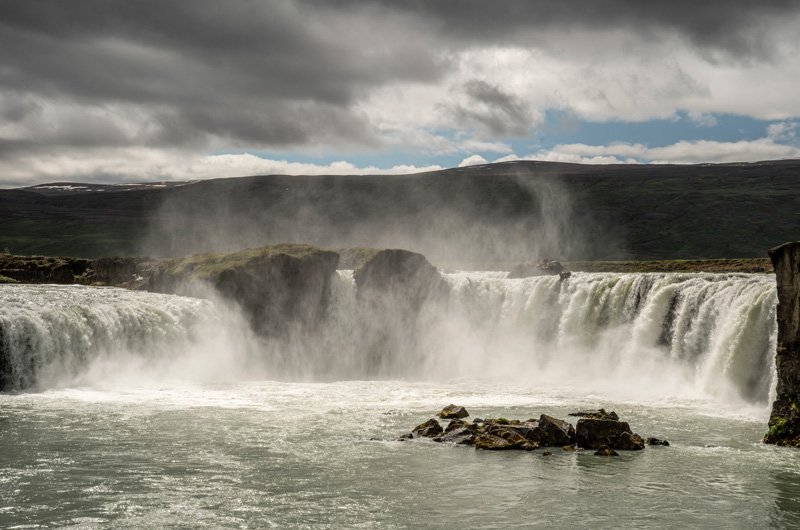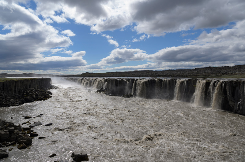 Meine Route führt mich weiter nach Norden. Über die Ringstraße geht es recht bequem zu den nächsten Naturschönheiten. Wer sich früh auf den Weg macht, der kann die Ringstraße hinter Skjöldólfsstadir verlassen und die parallel dazu verlaufende Schotterpiste 901 über Möðrudalur nehmen. Im höchstgelegenen Bauernhof Islands mit seiner Aussichtsterrasse empfiehlt sich ein Pausenstopp. Die gegenüberliegende Tankstelle im kleinen Grassodenhäuschen habe ich mich nicht getraut zu testen. Aber ein Fotomotiv ist sie wert. Zu lange sollte man sich nicht dort aufhalten, sonst ist der Tag zu lang. Denn auf dem Weg zum Mývatn liegt noch der Dettifoss. Schnell und bequem ist die Anfahrt über die 862. Ein riesiger Parkplatz für Busse ist der beste Hinweis auf die hohen Besucherzahlen. Gigantische Massen an grauem Gletscherwasser stürzen auf einer Breite von knapp 100m auf 44m in die Tiefe. Es ist der größte Wasserfall Europas. In dessen Schatten liegt der benachbarte Selfoss, den man über einen ausgetretenen und ausgeschilderten Pfad gut erreichen kann. Der Fluss stürzt hier nur 13m tief, aber er bezaubert mit seiner V-förmigen Schlucht durch die das Wasser von allen Seiten stürzt. Mich hat der Selfoss so fasziniert, dass ich beschließe am Folgetag am frühen Morgen von Mývatn zurück und dieses Mal auf der 864 zu beiden Wasserfällen zu fahren. Die 864 hat allerdings ihre Tücken. Das erklärt, dass hier der Besucherstrom wesentlich geringer ist. Busse fahren ohnehin diese Seite nicht an. 28km Schotterpiste wie ein Waschbrett. Ich komme selten an die 30km/h heran. Hier hätte ich mir ein Allradfahrzeug gewünscht. Aber die Mühe lohnt. Das Morgenlicht stellt beide Wasserfälle in Szene und die nervige Anfahrt ist schnell vergessen, jetzt wo die Sonne den Selfoss zum Glitzern bringt und die Kaskaden das Gletscherwasser in die Schlucht fallen lässt.