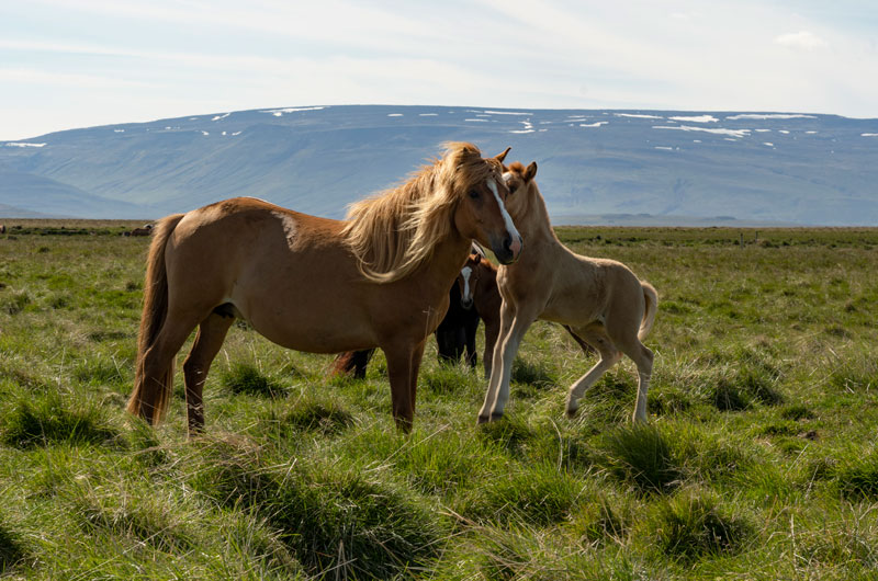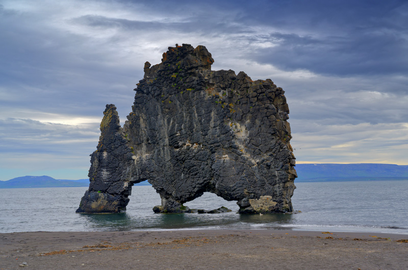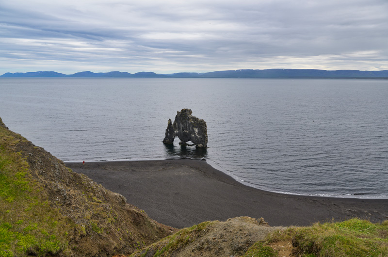 Was wäre Island ohne seine Pferde? Auf der Fahrt nach Gauksmyri sehe ich zahlreiche Pferdekoppeln. Und diese Region ist eine der Hochburgen. Über 30km Schotterpiste fahre ich zum Parkplatz oberhalb der Bucht Júnafjörður. Ein ca. 3-minütiger Fußweg führt zu einer Aussichtsplattform mit Sicht auf den Hvítsekur, einem Lavabrocken im Meer der als Drache oder Troll beschrieben wird. Ich klettere den Hang hinunter und bin froh auf meine Bergschuhe, die ich heute eher zufällig trage. Das erleichtert den Abstieg ungemein. Der Koloss steht auf dem schwarzen Lavastrand und je nach Gezeiten wird er von mehr oder weniger Wasser umspült.