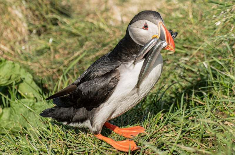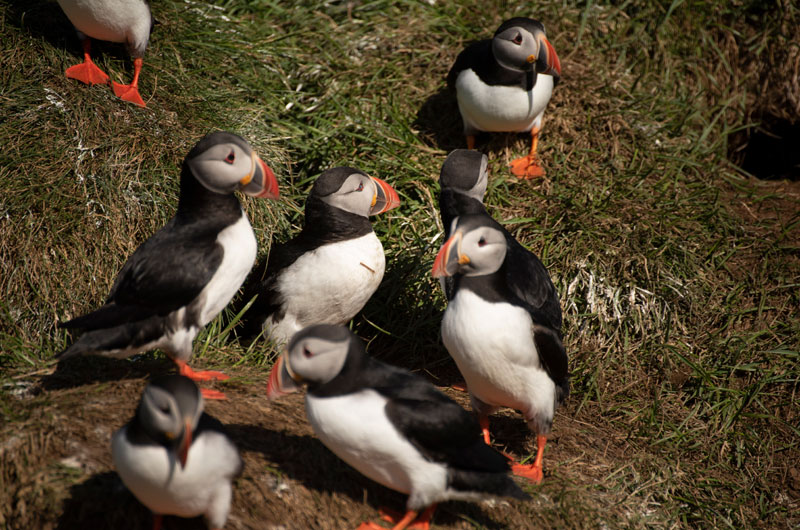 Am nächsten Tag folge ich einem Tipp. Von Seyðisfjörður aus mache ich mich auf den Weg über Asphaltstraßen und Schotterpisten auf der 94 nach Bakkagerði (Borgarfjörður Eystri). Im kleinen Hafen Hafnarhólmi nordöstlich von Bakkagerði erlebe ich Ende Juni ein für mich ganz besonderes Spektakel. Von den Treppen und auf der Aussichtsplattform des Vogelfelsens beobachte ich hautnah Papageitaucher. Tagsüber sind die drolligen Flugkünstler auf dem Meer, gegen Nachmittag/Abend kommen sie zur Fütterung ihrer Jungtiere angeflogen. Es ist ein lustiges Schauspiel. Die Papageitaucher lassen sich durch meinen Besuch nicht stören. Unbeeindruckt geht es über meinem Kopf hinweg Richtung Meer oder es wird zur Landung angesetzt. Hier könnte ich noch stundenlang verharren.
