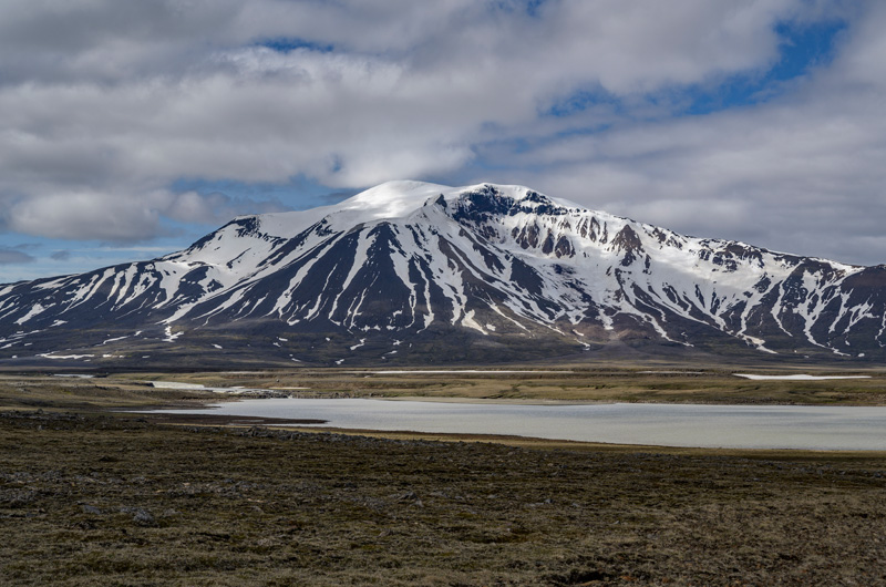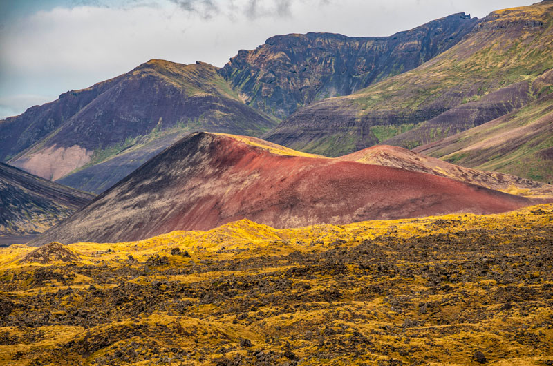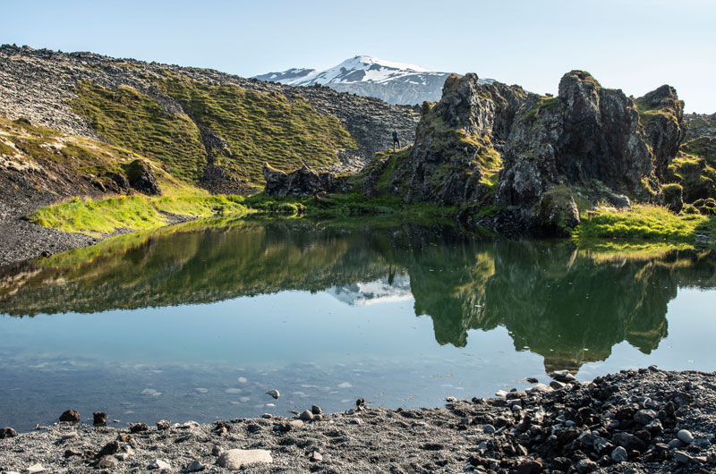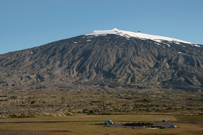 Wie praktisch, dass die Tage im Sommer hier lang sind. Ich starte früh und wähle eine landschaftlich schöne und einsame Route, die mich bei Staðarskali über die 59 und dann die 54 an den Hvammsfjörður führt. Die Ausblicke entschädigen mich für die holprige Fahrt auf der Schotterpiste. Langsam nähere ich mich meinem Ziel: Grundarfjörður. Nach der Schaukelfahrt bin ich froh, mir noch ein wenig die Beine vertreten zu können. Bekannt ist der Ort für den 436 m hohen Kirkjufell der oft gemeinsam mit dem kleinen Wasserfall Kirkjufellsfoss im Vordergrund abgebildet wird. Das ist nicht nur ein beliebtes Fotomotiv, sondern der Berg kommt auch in vielen Filmen vor, die in Island spielen. Anderntags lacht die Sonne aber erst einmal nicht. Egal, für ein Erinnerungsbild ist es auf jeden Fall gut. Von Grundarfjörður nehme ich die Küstenstraße, die mich über Ólafsvík und Hellissandur auf die andere Seite der Halbinsel in den Snæfellsjökull National Park führt. Der Krater Saxhóll steht ganz imposant an der Straße. Eine Treppe am Kraterrand entlang führt hoch bis an den Rand. Der Wind pfeift extrem, aber der kurze Aufstieg lohnt. Und er hat sein Gutes – er gibt die Sicht auf den sagenumwogenen Snæfellsjökull frei. Ein idealer Tag für eine Fahrt hoch zum Gletscher. Über die 570 kann man hinauffahren. Diese Schotterpiste ist allerdings eng und steil und es ist mit Gegenverkehr zu rechnen.