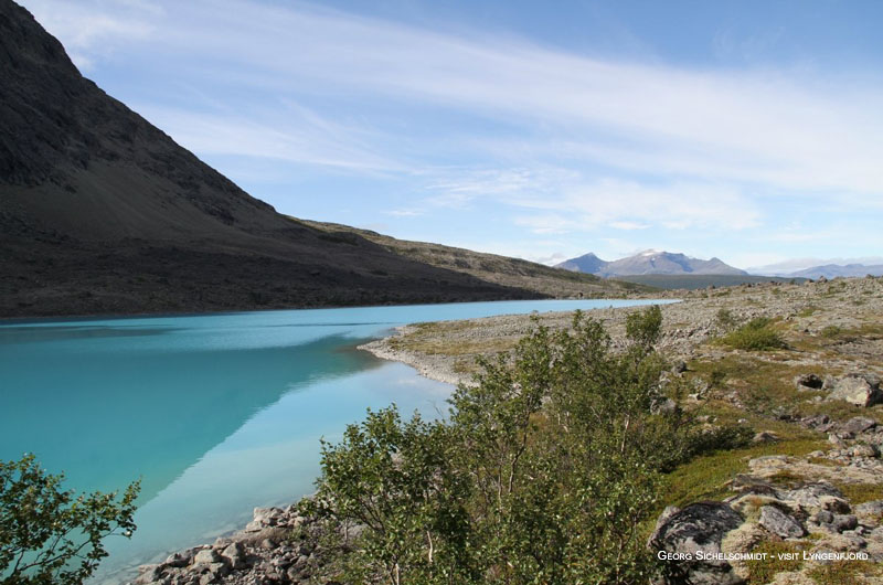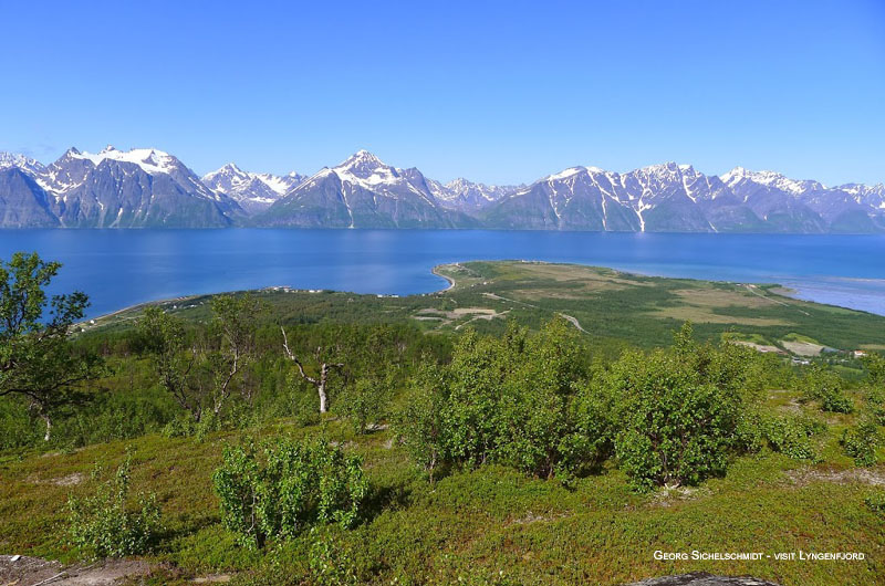 Nahe der Küste und in den Tälern teilen sich Wiesen und Wälder die Gegend mit Gutshöfen. Die umliegenden Berge sind in der Regel unberührt, da sie durch die Gletscher und deren Seitenmoränen (= Schuttmasse des Gletschers) kaum nutzbar sind. Die Berge, die auf der Lyngenhalbinsel liegen werden „Lyngen Alpen“ genannt. Steile Berge, die direkt aus dem Fjord bis über 1.800 Meter in die Höhe ragen, sind ein echtes Highlight in der Gegend und weltweit bekannt.